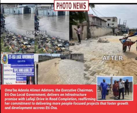 The Executive Chairman of Eti-Osa Local Government, Omo’ba Adeola Alimot Adetoro, has fulfilled her promise to improve road infrastructure in the area with the completion of the Lafiaji Drive In Road project.